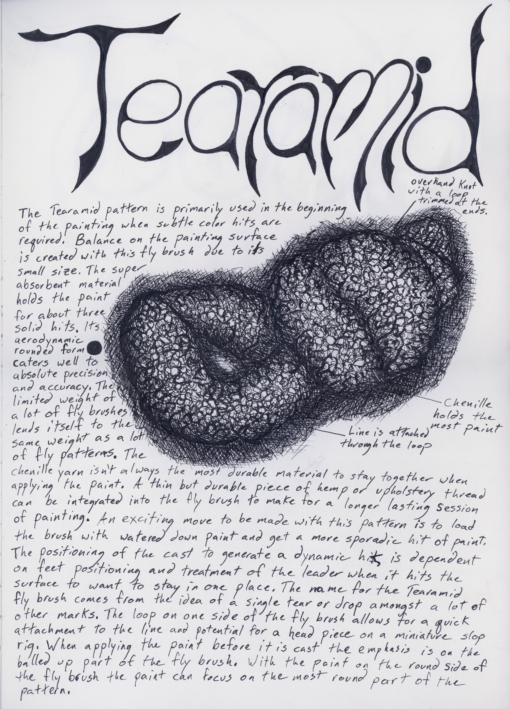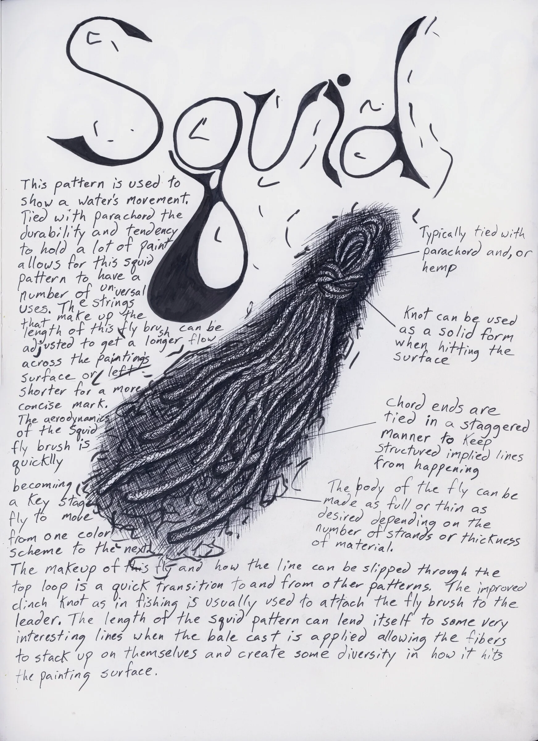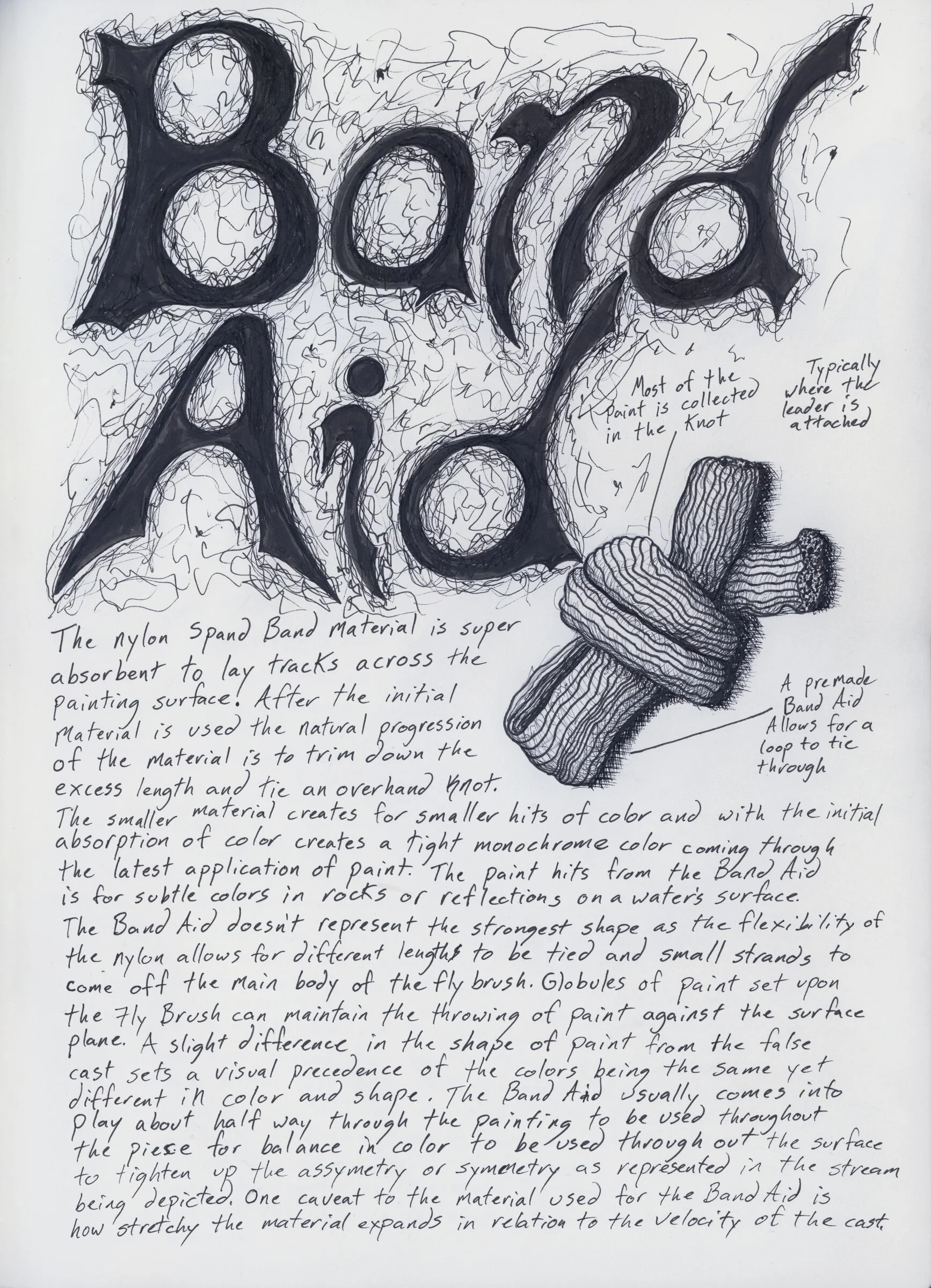 Each Fly Brush behaves differently in motion, delivering its own weight, rhythm, and pattern of marks. Illustrated and named in Miller’s own journal, they form a working vocabulary that allows him to respond to the river one cast at a time. Some Fly Brushes strike softly and disperse color. Others hit with force, fragmenting paint or leaving dense accumulations.